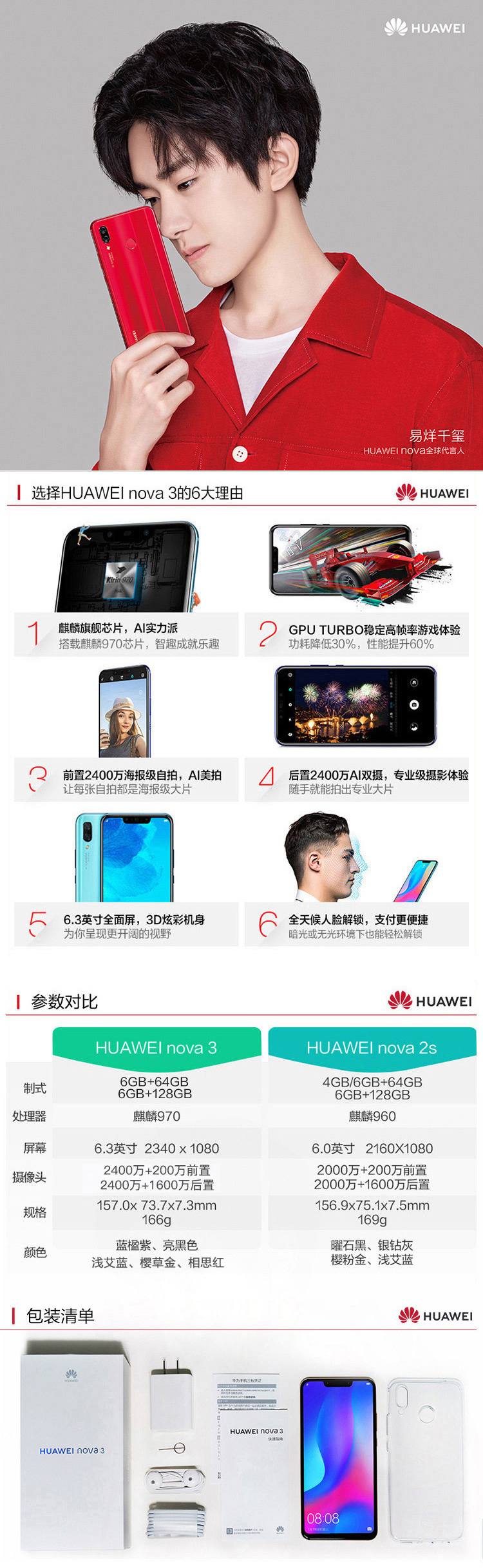 华为 HUAWEI nova 3全面屏高清四摄游戏手机 6GB+128GB 亮黑色 全网通移动联通电信4G手机 双卡双待